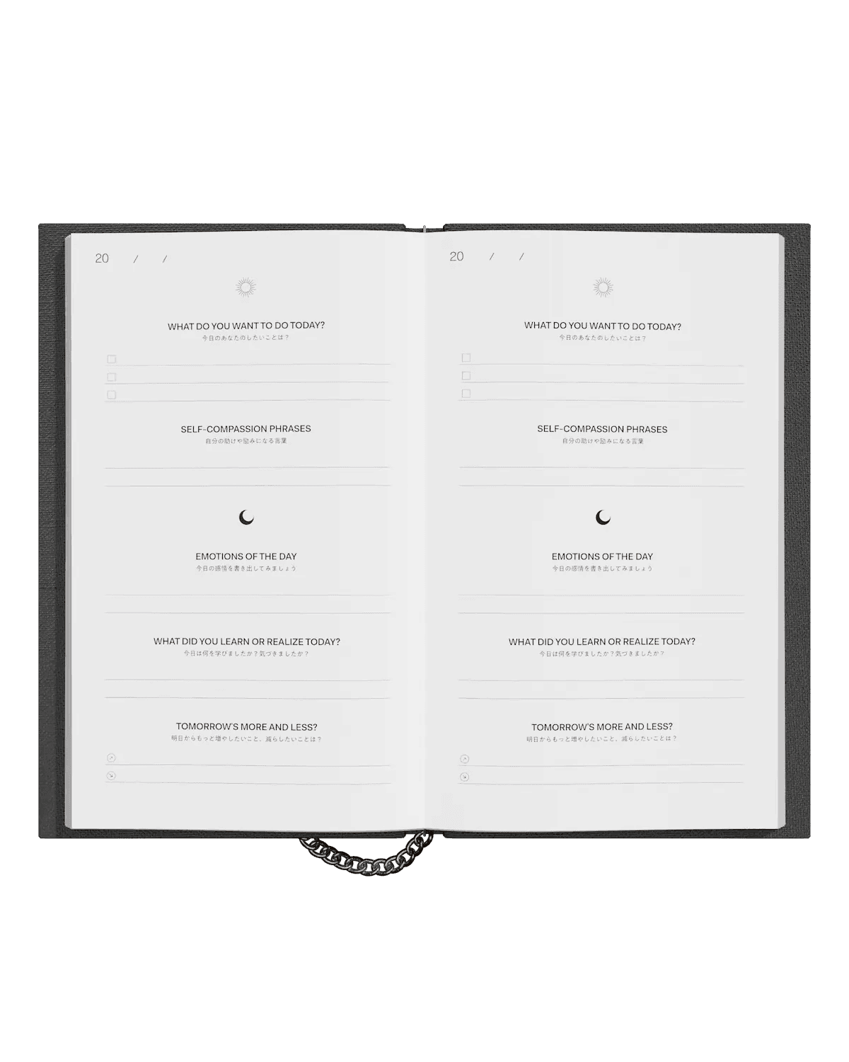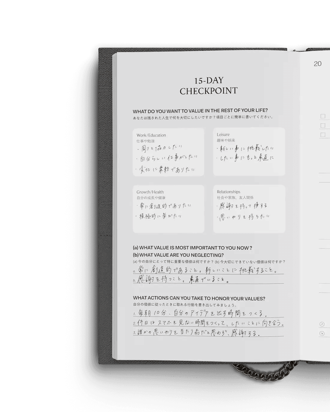 15-DAY CHECKPOINT は、15日ごとに一度立ち止まり、自分の「価値観」を確認するページです。 仕事、趣味、人間関係。人生のバランスを俯瞰し、 今大切にできているものと置き去りにしているものに気づきましょう。