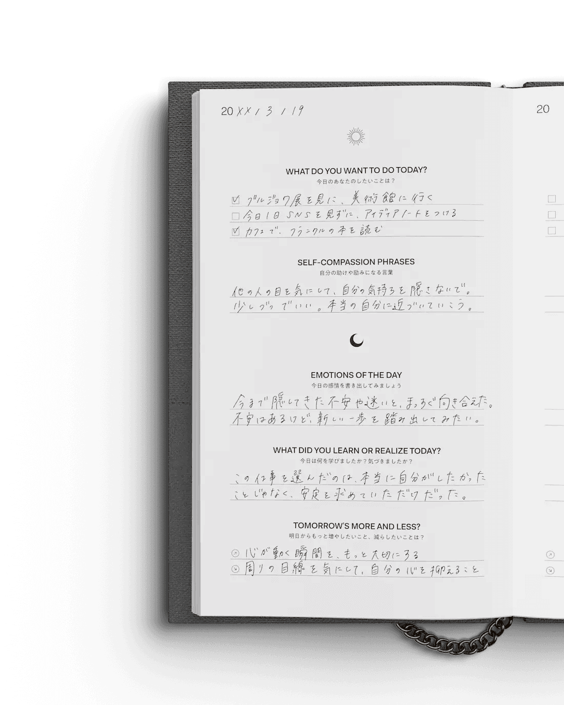 朝と夜、シンプルな問いに答えるだけで、 自然と自分自身に向き合う習慣になります。