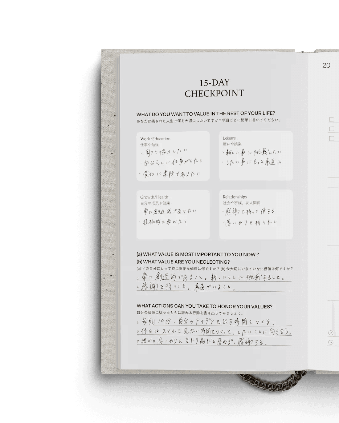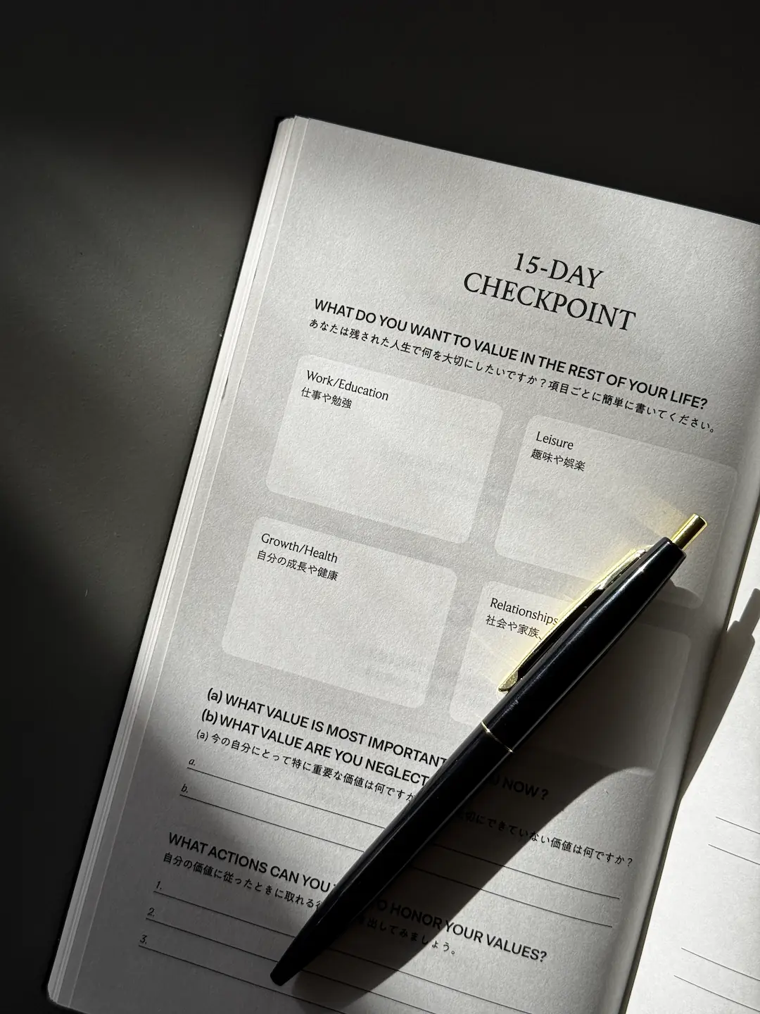 15-DAY CHECKPOINT は、15日ごとに一度立ち止まり、自分の「価値観」を確認するページです。 仕事、趣味、人間関係。人生のバランスを俯瞰し、 今大切にできているものと置き去りにしているものに気づきましょう。