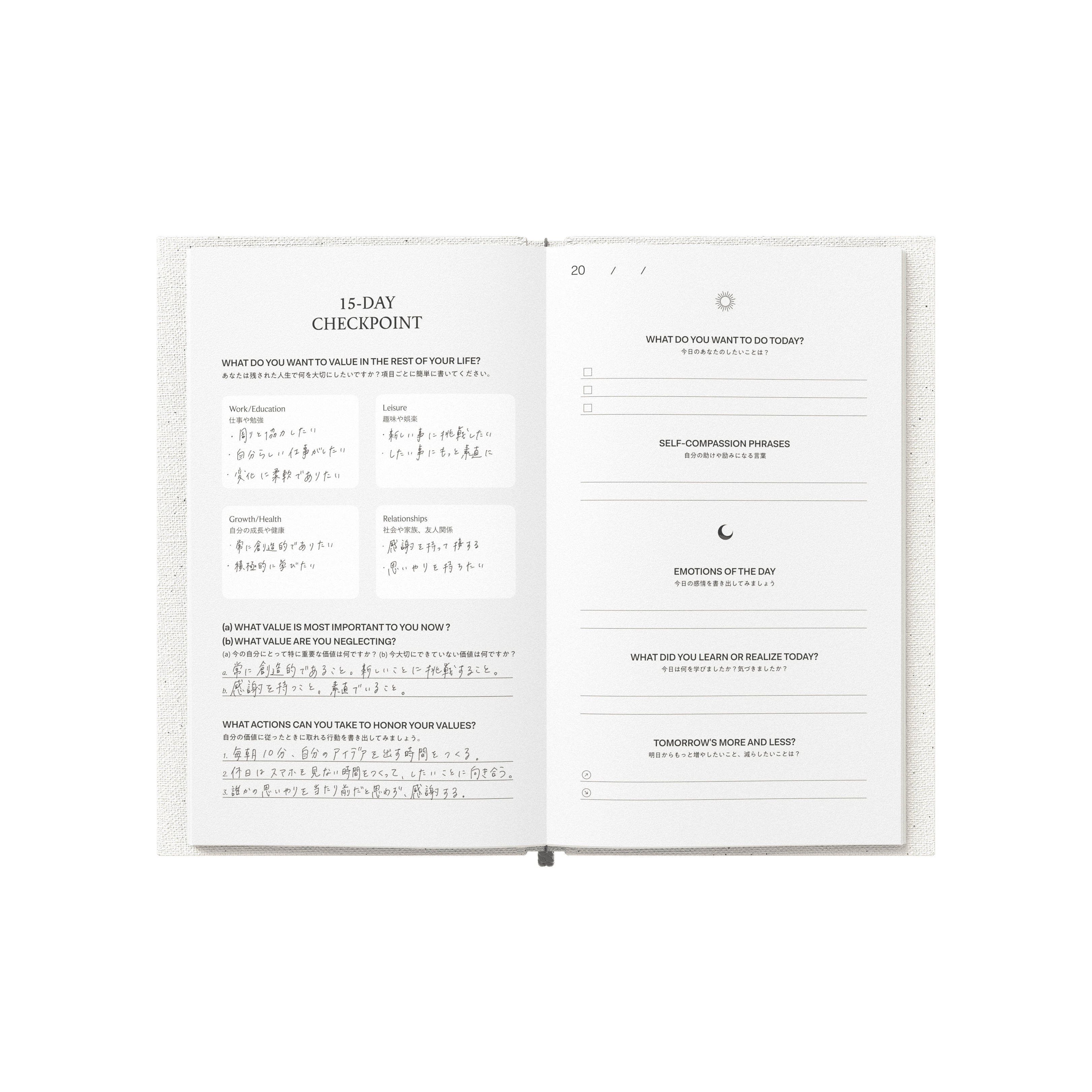 15-DAY CHECKPOINT は、15日ごとに一度立ち止まり、自分の「価値観」を確認するページです。