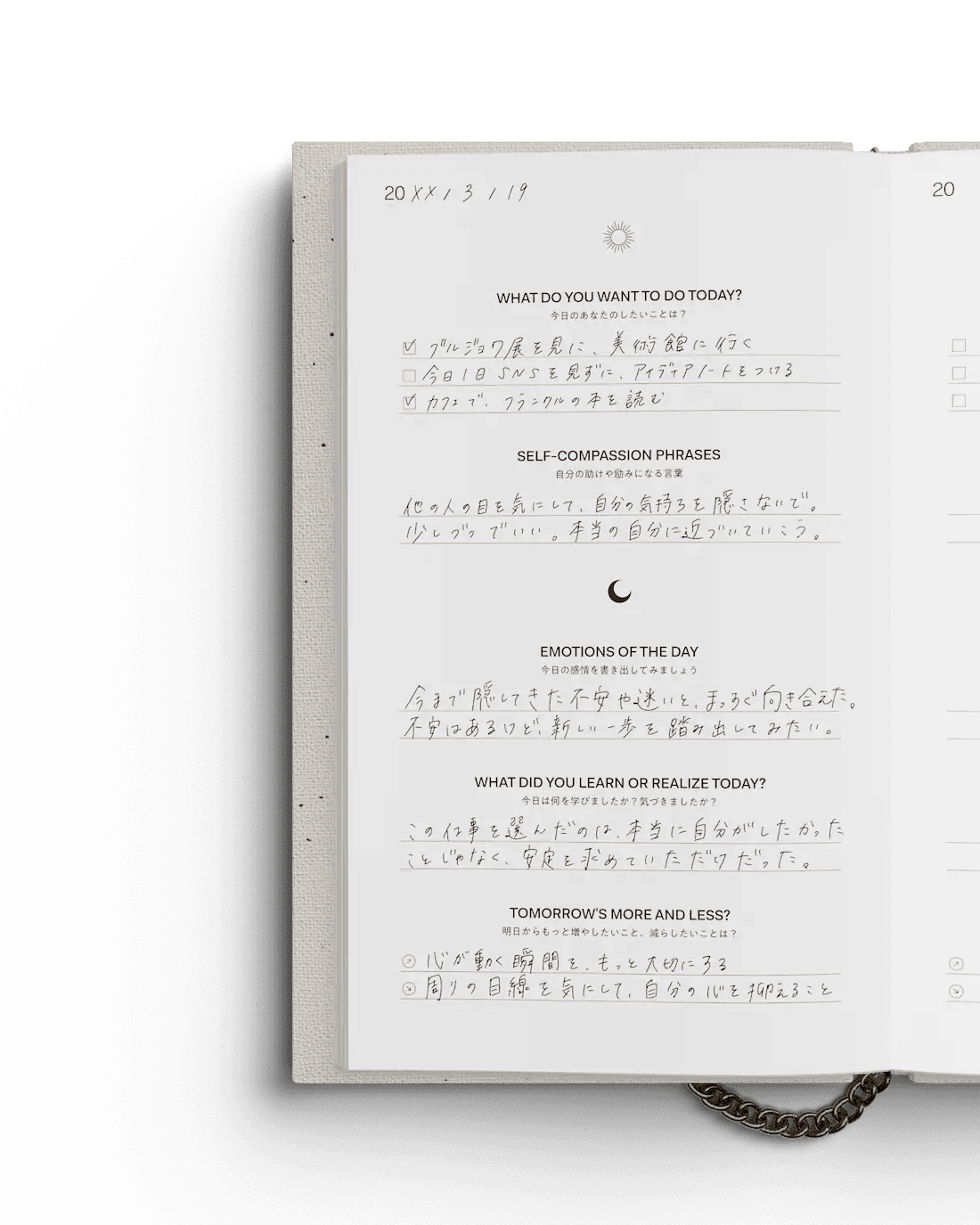 今日、どんな感情が生まれたか。何を気付き・学んだか。明日のために何ができるのか。感情や思考を整理し、自分の心の動きや本音を知る。 夜の一日を振り返る時間が、より充実した明日を作る準備になります。