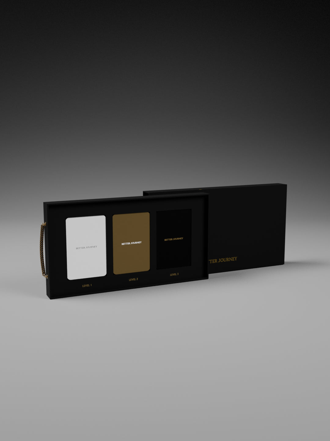 Close-up of BETTER JOURNEY Creative Journal cover in black, featuring gold lettering and brass chain bookmark